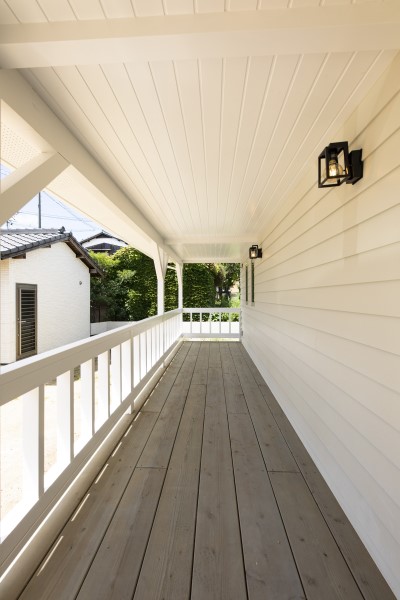 外観はカルフォルニアを意識して・・・広々カバードポーチ。